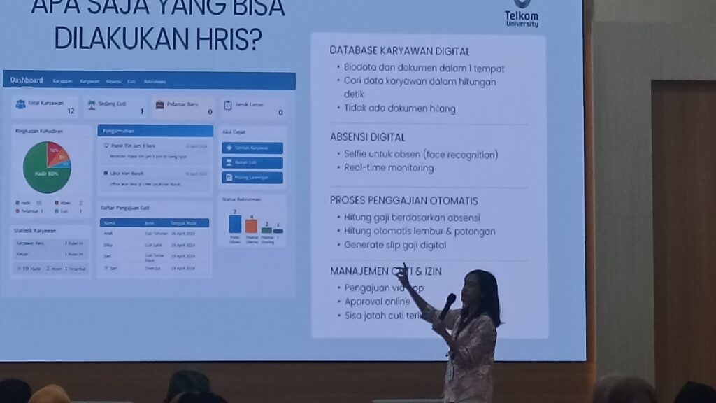 Salah satu materi utama yang disampaikan adalah pemanfaatan Human Resources Information System (HRIS) sebagai solusi praktis untuk membantu UMKM mengelola data karyawan, absensi, penggajian, hingga monitoring kinerja secara lebih terstruktur dan efisien. Selain menyampaikan materi, Ibu Alfilia juga sedang melakukan riset penelitian terkait pengembangan sistem atau aplikasi HRIS yang dirancang untuk menyesuaikan kebutuhan UMKM, sehingga diharapkan mampu menghadirkan solusi pengelolaan SDM yang lebih praktis, efisien, dan mudah diimplementasikan oleh pelaku usaha.